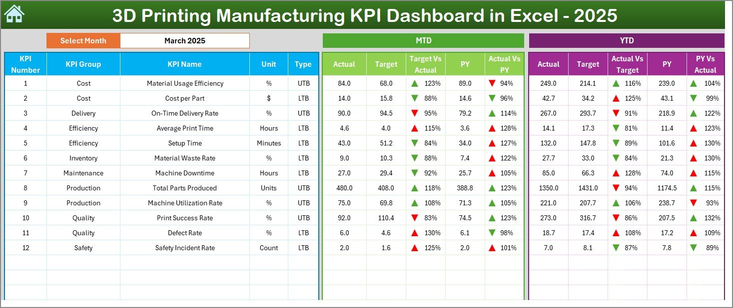 📦 What’s Inside the 3D Printing Manufacturing KPI Dashboard in Excel
