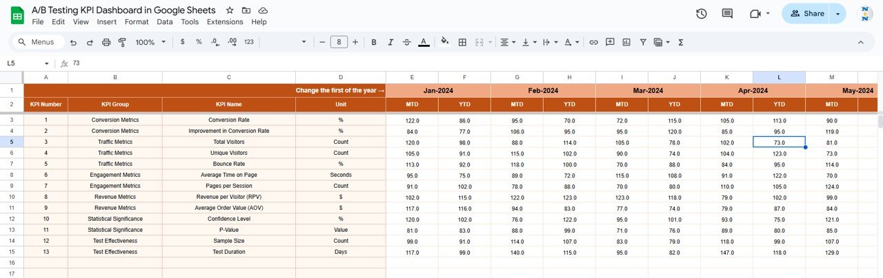 Because the dashboard is built in Google Sheets, it remains cloud-based, collaborative, cost-effective, and easy to customize. Marketing teams, product managers, CRO specialists, and leadership teams can access real-time insights without complex BI tools or technical dependencies.A/B Testing KPI Dashboard in Google Sheets