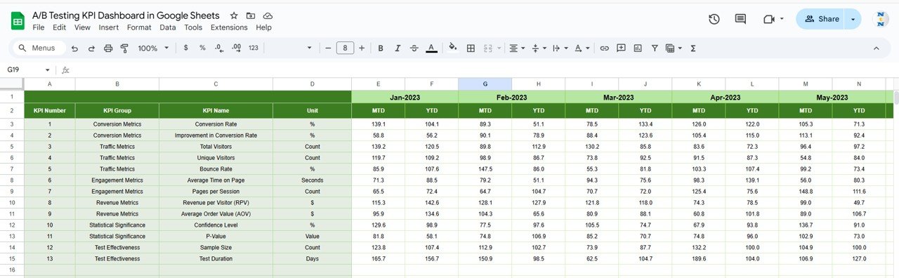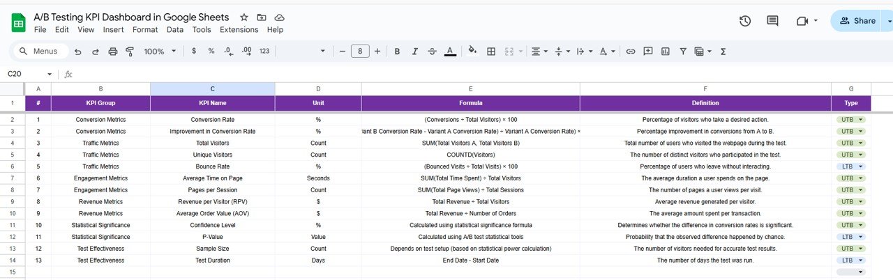 🚀 Key Feature of A/B Testing KPI Dashboard in Google Sheets