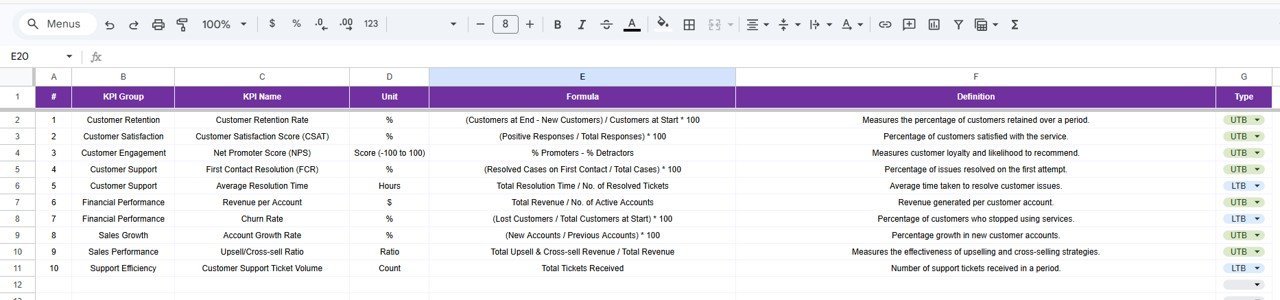 📚 KPI Definition Sheet: Understand each KPI by name, group, unit, formula, and type (LTB or UTB), making data interpretation simple.