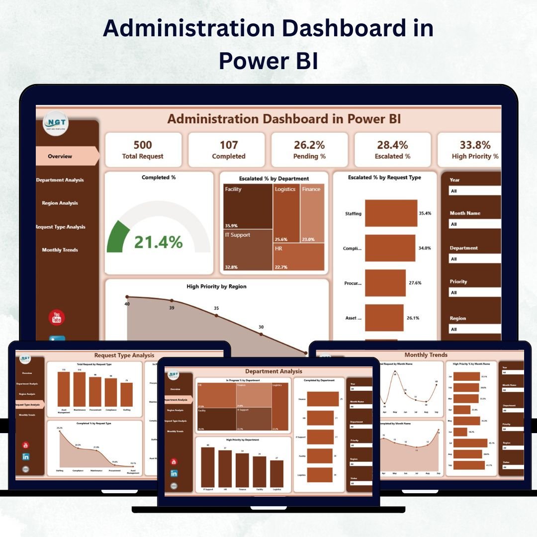 This ready-to-use, interactive dashboard consolidates all your administrative metrics into one visual platform. Built on Power BI and powered by an Excel data source, it helps leaders monitor performance, detect bottlenecks, and drive productivity — all at a glance.