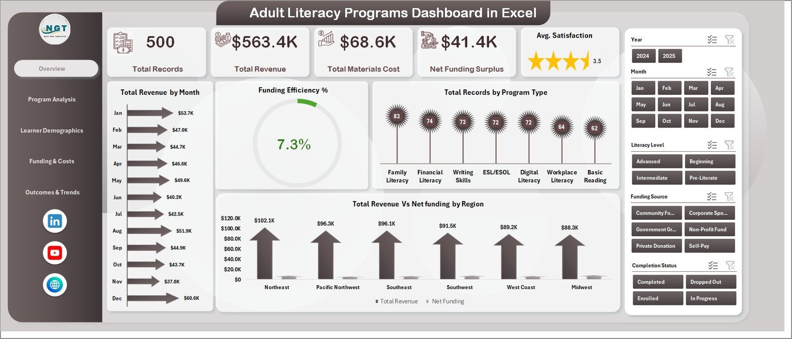 Adult Literacy Programs Dashboard in Excel📊 Overview Page — Displays high-level KPI cards including Total Records, Total Revenue, Total Materials Cost, Net Funding Surplus, and Avg. Satisfaction. Charts include Total Revenue by Month showing monthly revenue trends for budget planning, Funding Efficiency % measuring how well funds are being utilized, Total Records by Program Type comparing enrollment across literacy program categories, and Total Revenue vs Net Funding by Region identifying which regions generate the most revenue and retain the highest funding surplus.