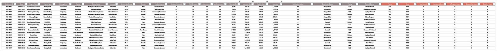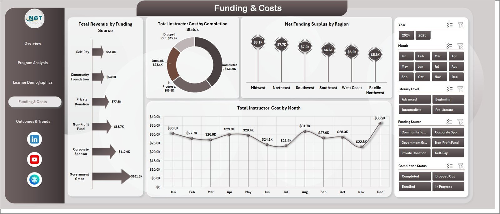 📊 5 Interactive Dashboard Pages — Overview, Program Analysis, Learner Demographics, Funding & Costs, and Outcomes & Trends provide complete 360-degree visibility into your literacy programs.