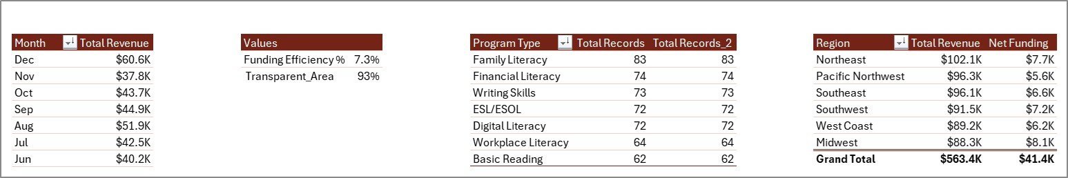 5️⃣ Use slicers on each page to filter by program type, region, literacy level, and more.