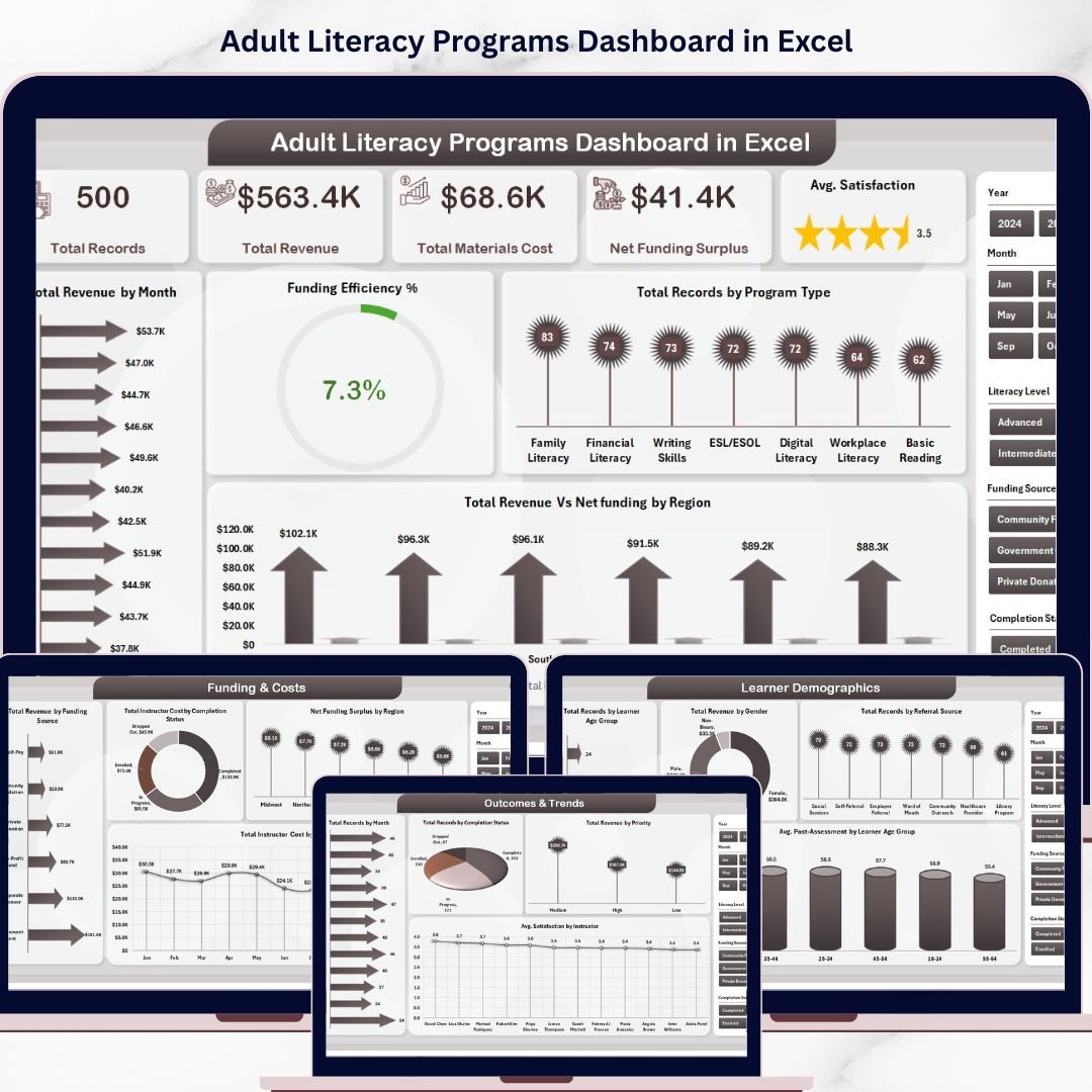 Adult Literacy Programs Dashboard in Excel is a powerful, ready-to-use analytics template designed to help literacy organizations, education departments, NGOs, and community development agencies transform their program data into interactive visual insights. This Excel dashboard tracks key metrics such as total revenue, materials cost, net funding surplus, and average learner satisfaction across multiple program types, literacy levels, regions, and demographics — all from one centralized workbook.
