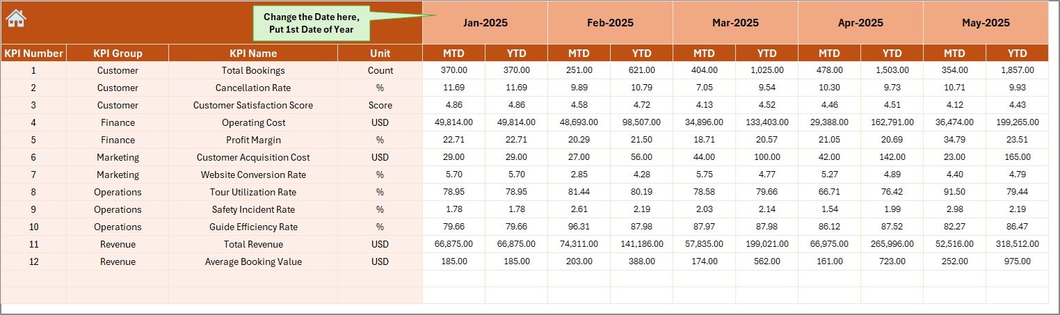 The Adventure Tourism KPI Dashboard in Excel is a ready-to-use, structured performance monitoring system designed specifically for adventure travel businesses. It enables managers to track Month-to-Date (MTD) and Year-to-Date (YTD) performance, compare Target vs Actual, and analyze Previous Year trends — all in one centralized dashboard 📊.