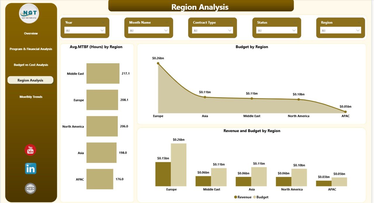 Compare MTBF, Budget, and Revenue across geographic regions for strategic resource allocation.