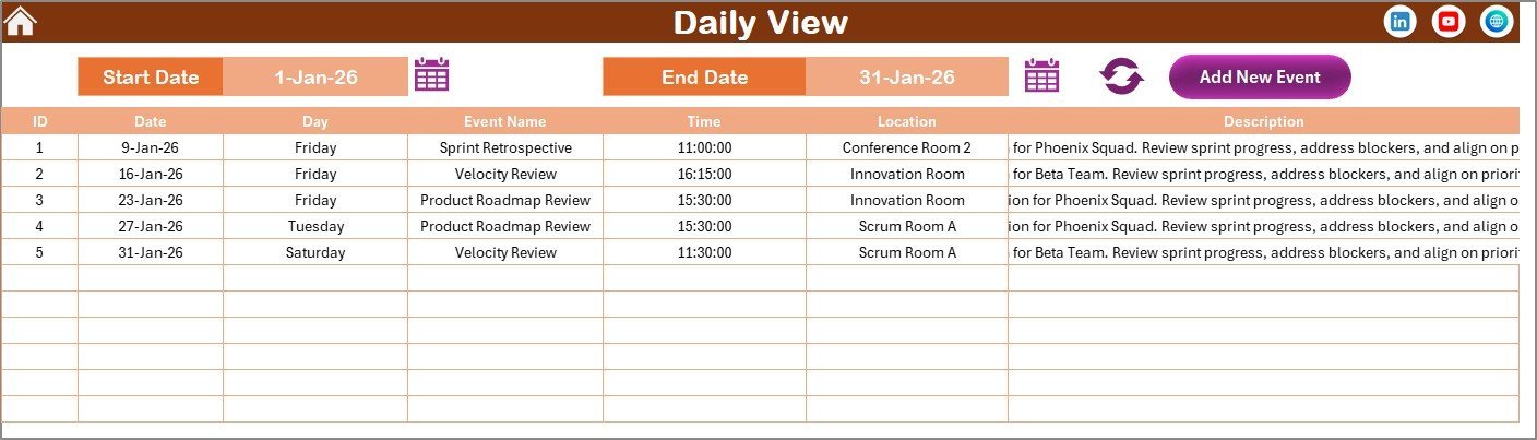 Daily View Sheet tab: This sheet details all events within a selected date range. Simply set your start and end dates using the calendar icons and refresh to see a comprehensive list of sprint activities.
