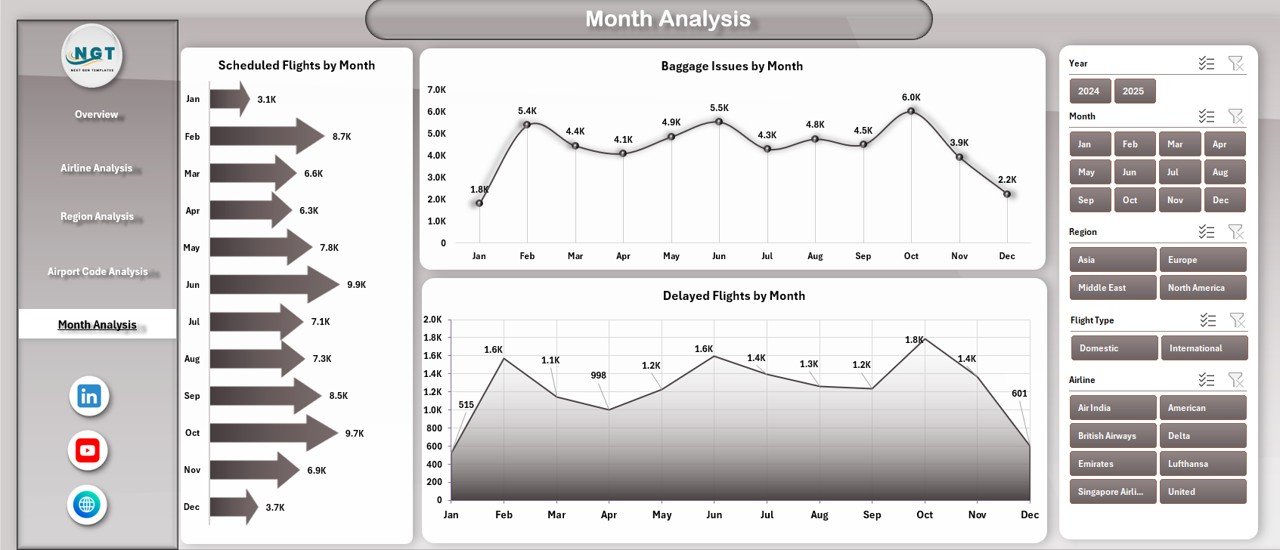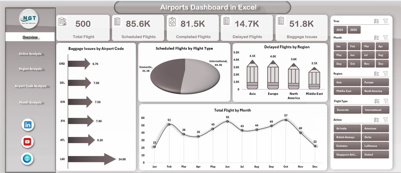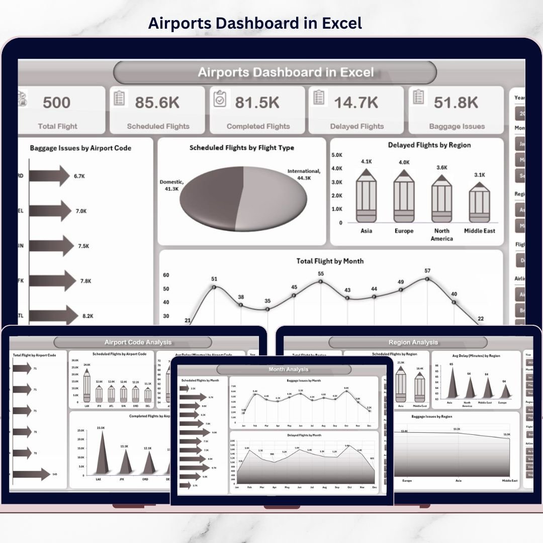 This ready-to-use Excel dashboard transforms complex airport operational data into clear, visual, and interactive insights. Instead of manually analyzing flight logs or delay reports, airport managers and aviation teams can instantly monitor performance across airlines, regions, airport codes, and months using dynamic charts and slicers.