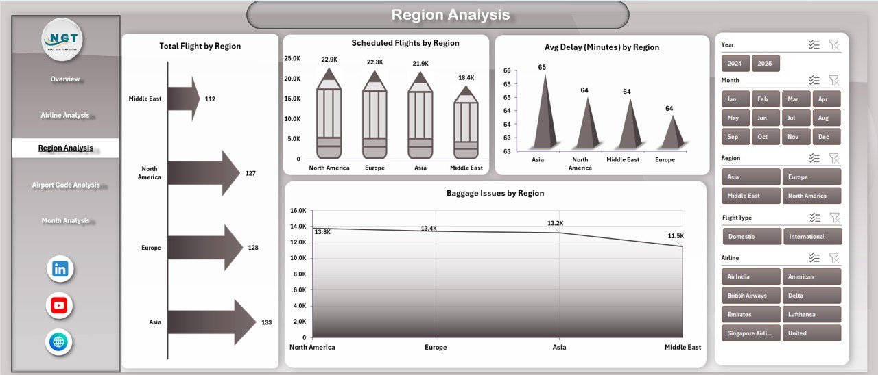 Provides region-level insights including total flights, scheduled flights, baggage issues, and average delay by region.