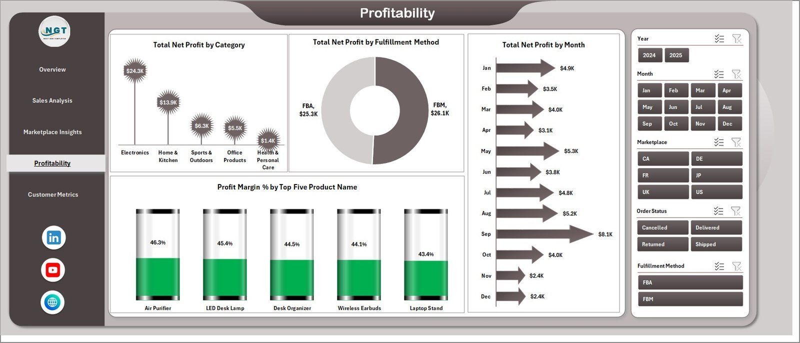 Whether you sell on Amazon US, UK, Canada, or any other marketplace, this template gives you instant visibility into your total revenue, net profit, refund rates, Amazon fees, PPC spend, and customer ratings. The dashboard features interactive slicers so you can filter your data by month, category, fulfillment method, and marketplace — making it incredibly easy to drill down into your Amazon FBA business performance.