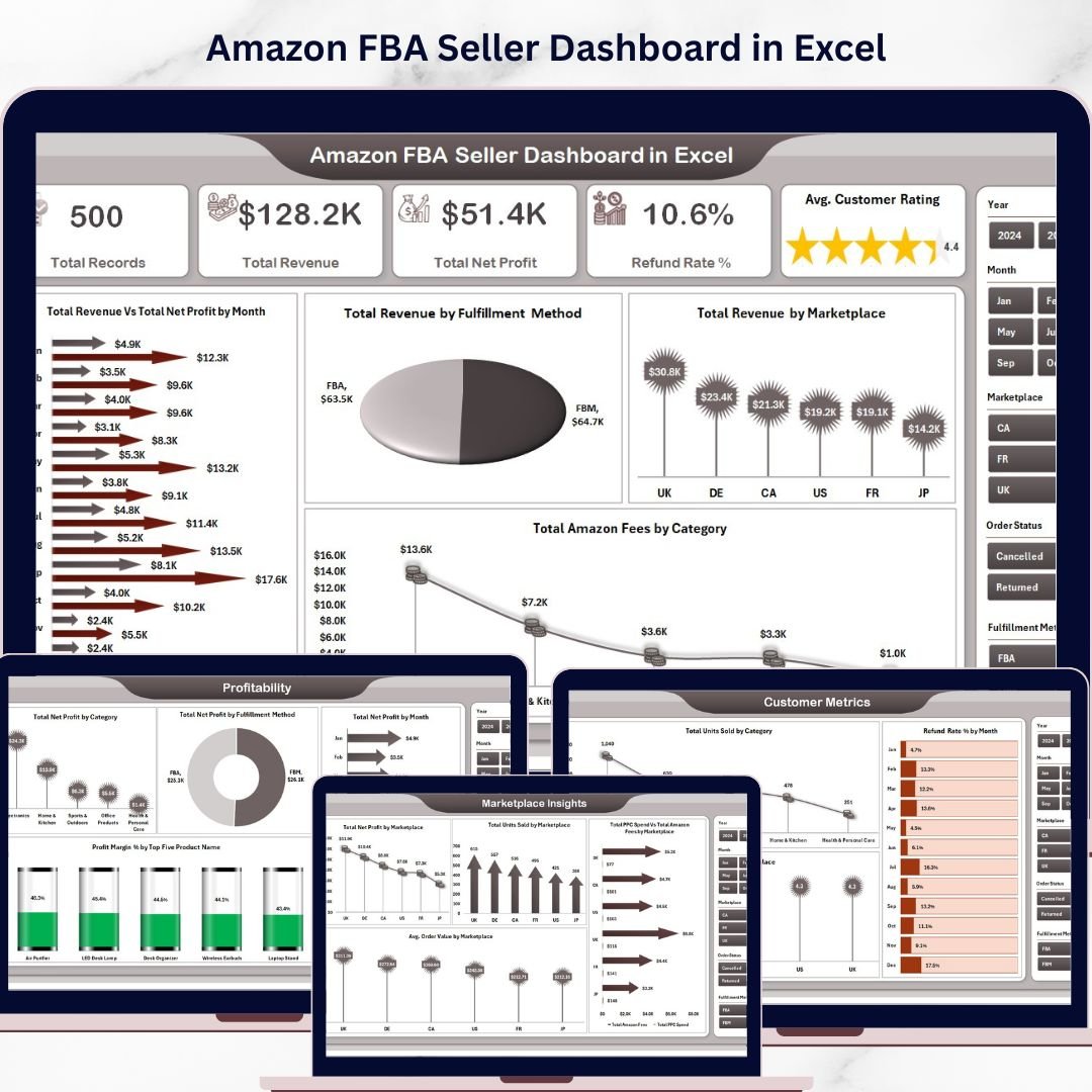 The Amazon FBA Seller Dashboard in Excel tracks 5 core KPIs: Total Records, Total Revenue, Total Net Profit, Refund Rate, and Average Customer Rating. It also includes 15+ charts across 5 pages covering sales trends, marketplace comparisons, profitability analysis, and customer behavior metrics.