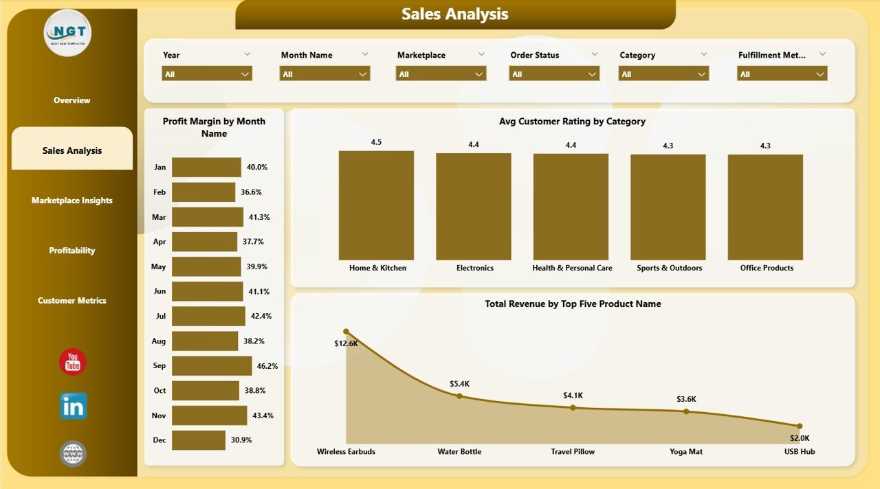 📌 Sales Analysis Page — Dive deeper into sales performance with Profit Margin by Month Name tracking monthly profitability trends, Avg Customer Rating by Category comparing customer satisfaction across product categories, and Total Revenue by Top Five Product Name identifying your best-selling products by revenue.