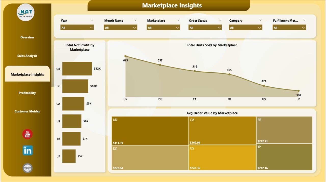 📌 Marketplace Insights Page — Compare performance across Amazon marketplaces with Total Net Profit by Marketplace identifying the most profitable selling regions, Total Units Sold by Marketplace comparing sales volume across countries, and Avg Order Value by Marketplace revealing which marketplaces generate the highest per-order revenue.
