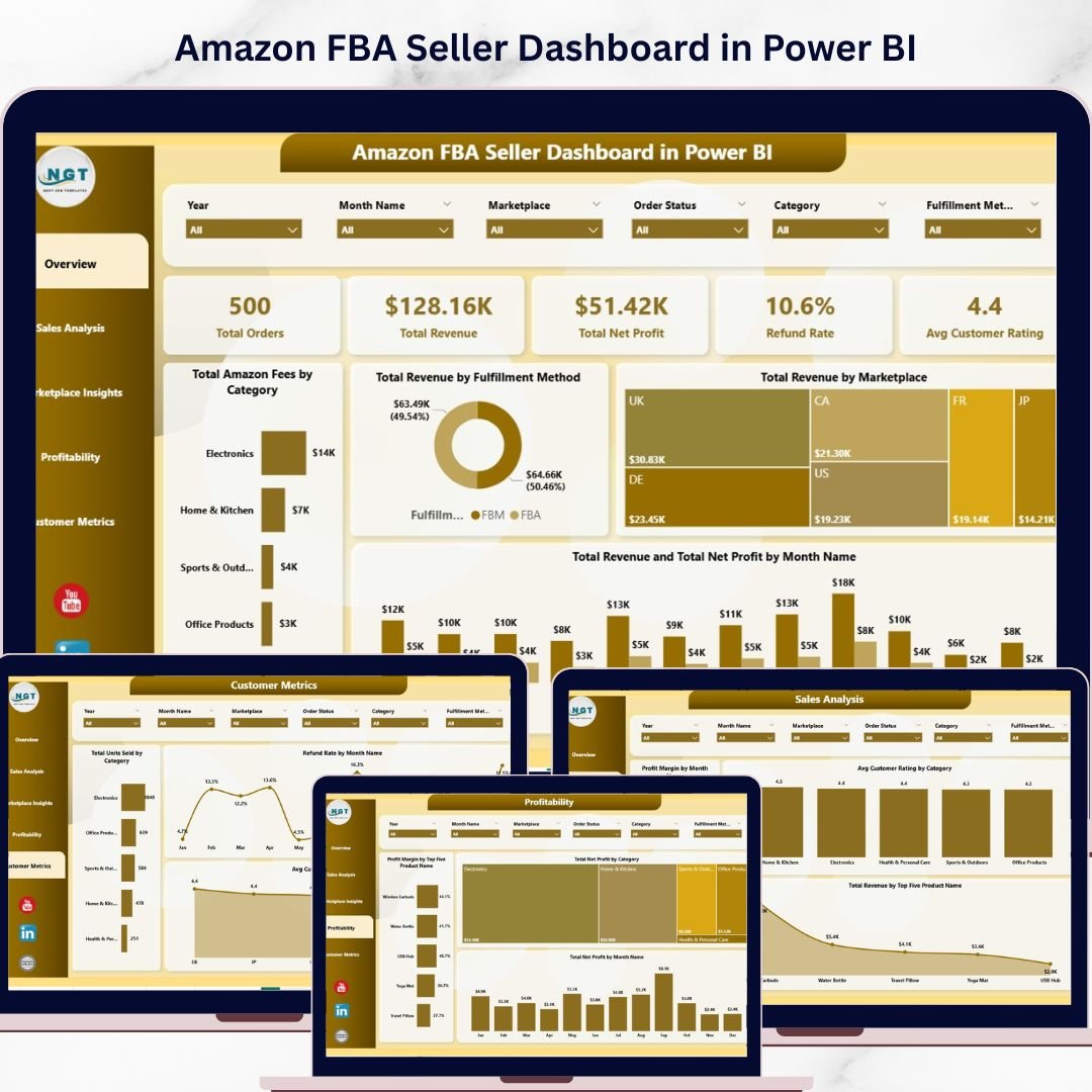 Amazon FBA Seller Dashboard in Power BI is a professionally designed, interactive analytics template built specifically for Amazon FBA sellers who want to monitor revenue, profitability, customer satisfaction, marketplace performance, and refund trends — all from a single dynamic Power BI dashboard. This template includes 5 interactive dashboard pages covering Overview, Sales Analysis, Marketplace Insights, Profitability, and Customer Metrics, delivering a complete 360-degree view of your Amazon seller business 🚀.