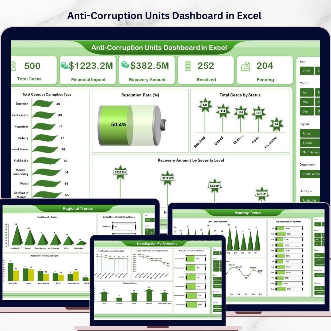 To solve this problem, we created the Anti-Corruption Units Dashboard in Excel — a powerful and ready-to-use Excel analytics solution designed to help organizations monitor corruption cases, evaluate investigation performance, and track financial recovery using interactive charts and KPI indicators.