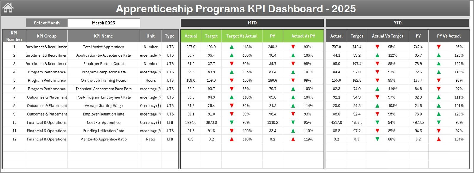 Review the Dashboard sheet regularly to monitor your apprenticeship KPIs, observe trends, and identify areas needing improvement. Use the conditional formatting and arrows to quickly spot whether you are meeting, exceeding, or falling short of your targets.