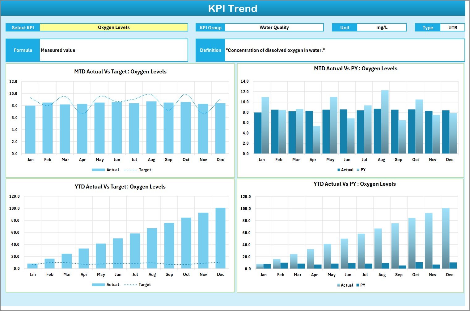 The Aquaculture KPI Scorecard in Excel tracks 10+ aquaculture KPIs across 4 structured worksheets, with automated MTD and YTD calculations, traffic-light indicators, and interactive trend charts. Setup takes under 10 minutes — replace the sample data with your own fish farm numbers and every metric updates automatically.