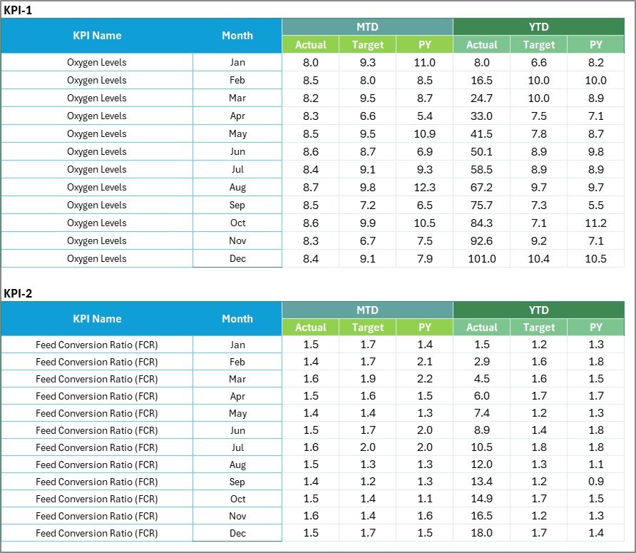 Aquaculture KPI Scorecard in ExcelThe Scorecard sheet is the main interface where you view KPI performance. Key features include: