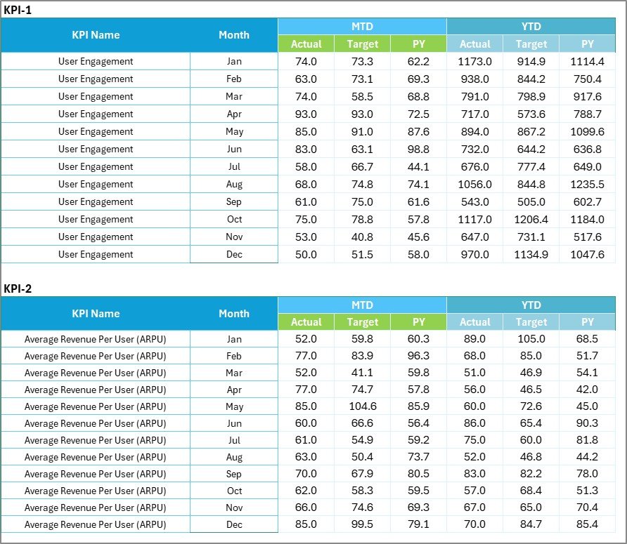 This professionally designed Excel scorecard allows you to monitor MTD and YTD performance, compare actual vs target values, visualize trends, and make smarter decisions — all in one place.