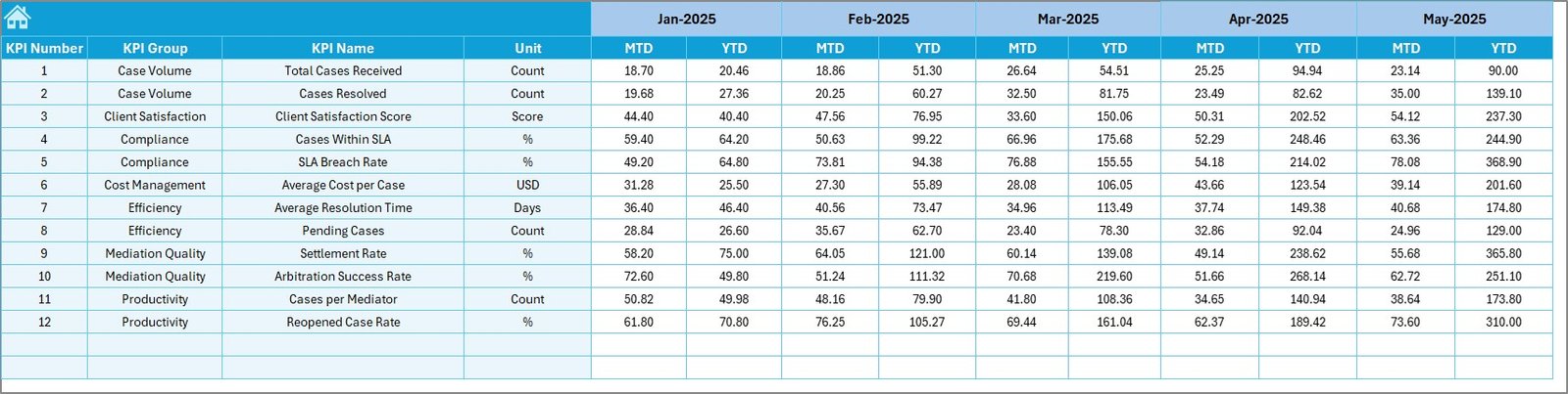 Arbitration and Mediation KPI Dashboard in Excel