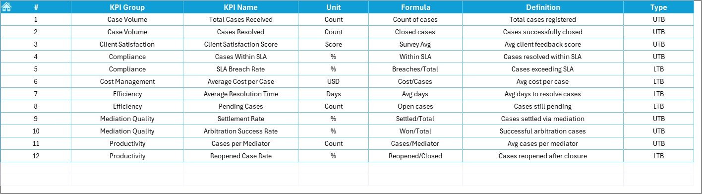 📦 What’s Inside the Arbitration and Mediation KPI Dashboard in Excel