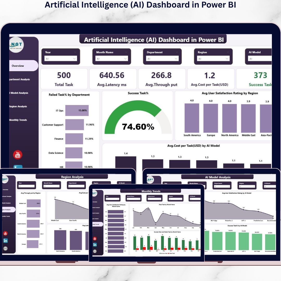 The Artificial Intelligence (AI) Dashboard in Power BI is a powerful, ready-to-use analytics solution designed to transform complex AI operational data into clear, actionable insights. This interactive dashboard enables organizations to track AI performance, evaluate model efficiency, monitor operational costs, and analyze performance trends — all from one centralized reporting platform.