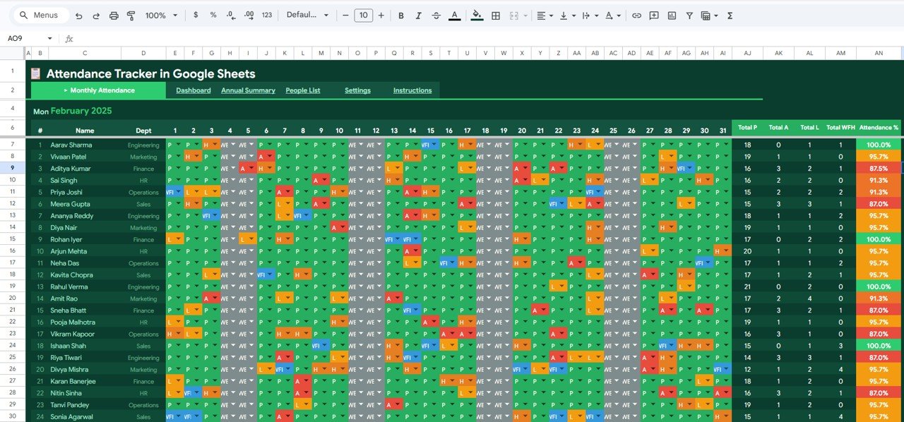 📅 Annual Summary with Color-Coded Heatmap — Track each employee’s attendance percentage month by month across the full year, with automatic highlighting of high and low attendance months