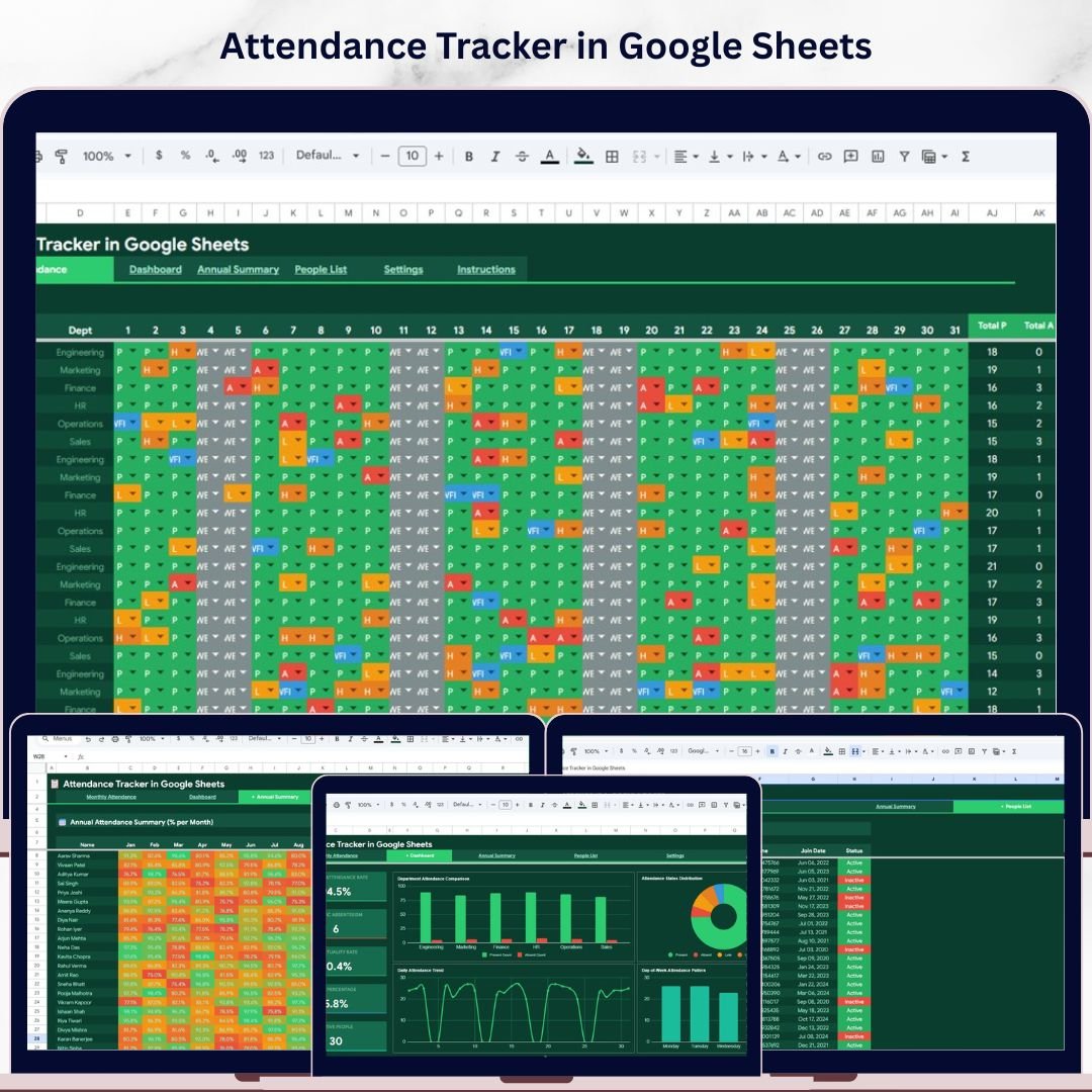 The Attendance Tracker in Google Sheets is a ready-to-use template that helps organizations record daily attendance, track absenteeism trends, and analyze workforce availability. It includes 5 sheets — Monthly Attendance, Dashboard, Annual Summary, People List, and Settings — all working together with automated calculations and color-coded visuals.