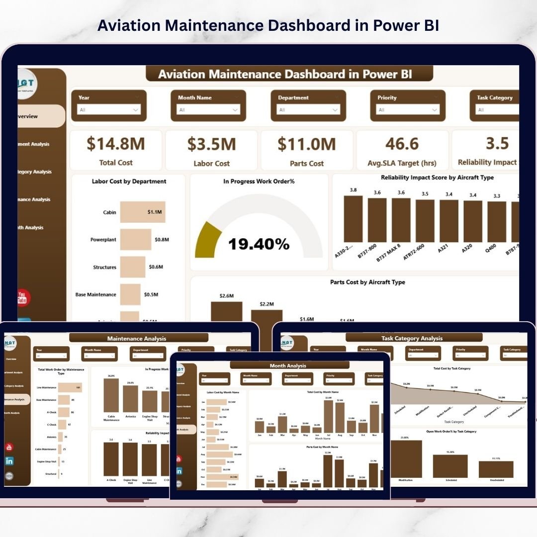 The dashboard contains five analytical pages that provide deep insights into aviation maintenance performance.