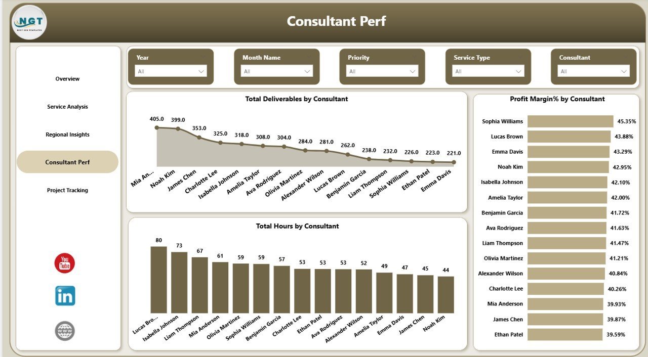 Absolutely. The Brand Consulting Dashboard includes dedicated pages for Service Analysis, Regional Insights, and Consultant Performance that let you track metrics across multiple clients, regions, and team members simultaneously. The slicer filters make it easy to isolate data for specific service types or consultants.