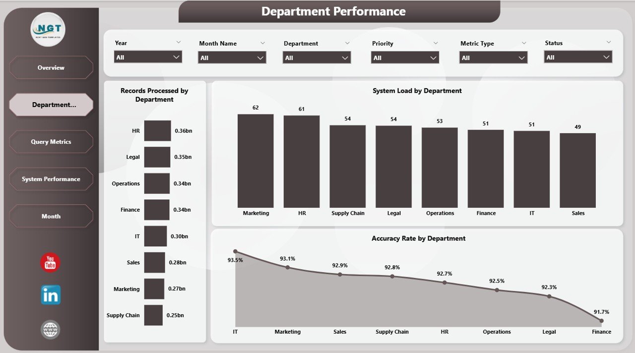 Interactive Multi-Page Dashboard – Analyze business data across Overview, Department, Query Metrics, System Performance, and Monthly Analysis pages.
