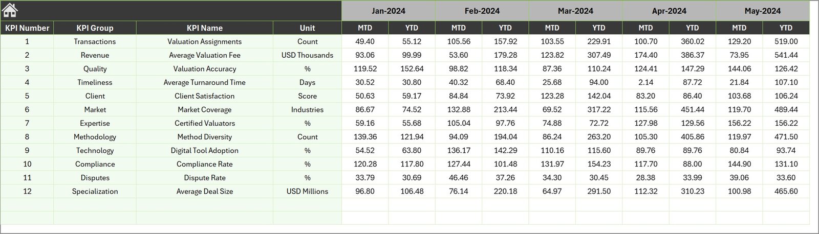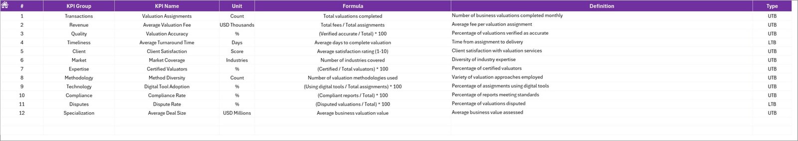 The Business Valuation KPI Dashboard in Excel is a powerful and ready-to-use Excel template designed to simplify KPI monitoring for business valuation and outsourced accounting activities. This professionally designed dashboard allows users to track, analyze, and compare key performance indicators using an interactive interface and dynamic visualizations.