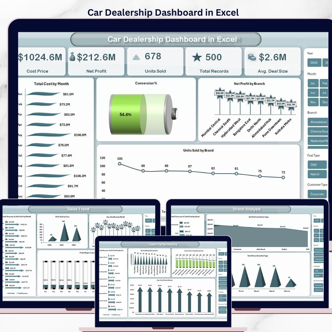 For independent dealerships and small multi-brand groups that want margin, conversion, and branch-level visibility without paying $600+ per month per rooftop, the Car Dealership Dashboard in Excel sits in the sweet spot.