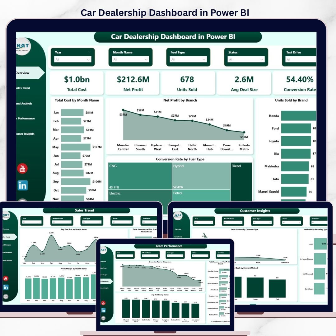 The Car Dealership Dashboard in Power BI tracks 5 header KPIs: Total Cost, Net Profit, Units Sold, Avg Deal Size and Conversion Rate. Derived DAX measures include Profit Margin %, Total Revenue and Net Profit by Brand, Branch, Salesperson, Vehicle Type, Fuel Type, Customer Type, Payment Method and Financing Type.
