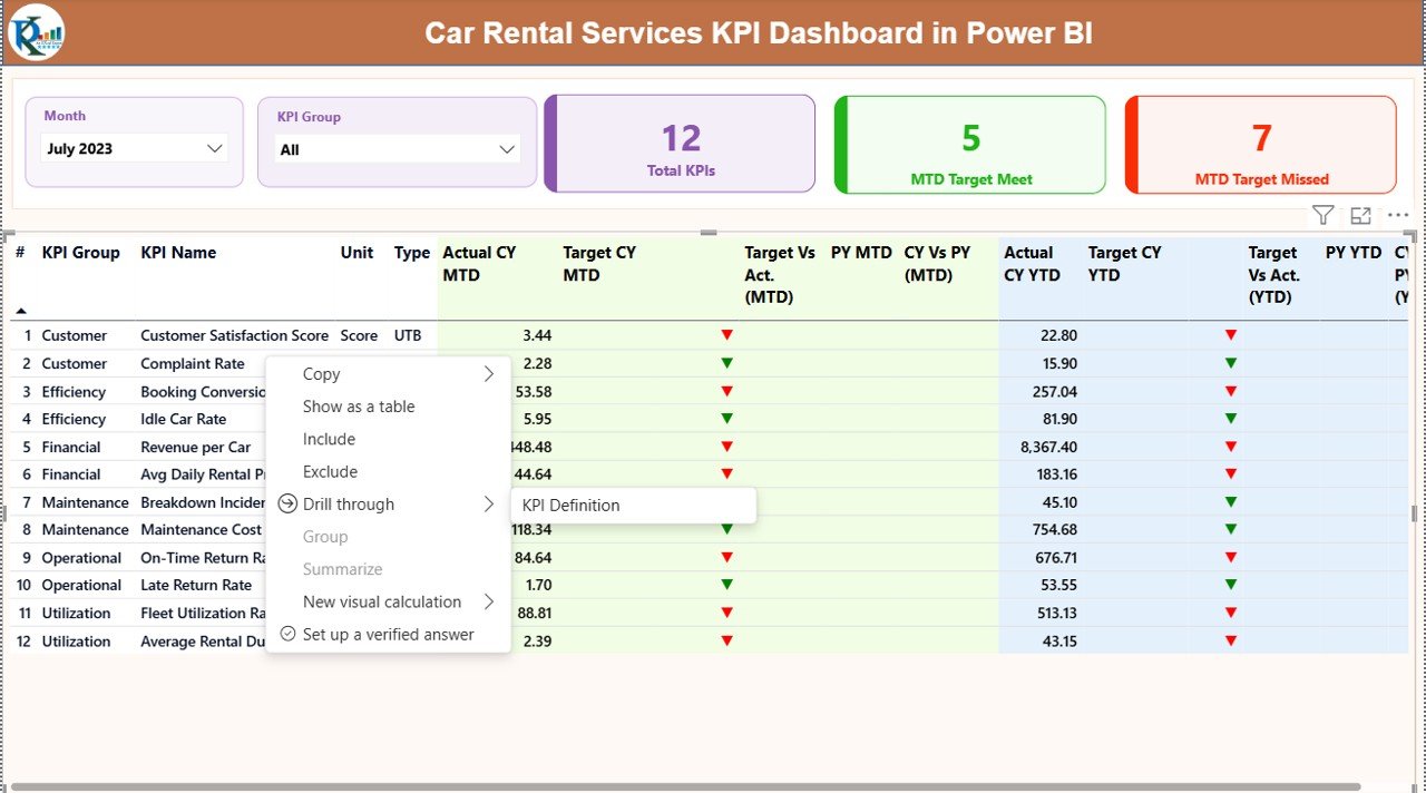 With just one click, managers can filter by month, KPI group, or performance category and instantly see whether targets are being met. The dashboard also displays MTD (Month-to-Date) and YTD (Year-to-Date) comparisons along with previous-year benchmarks. This makes it easier to identify improvements, monitor operational gaps, and make smart business decisions in real time.