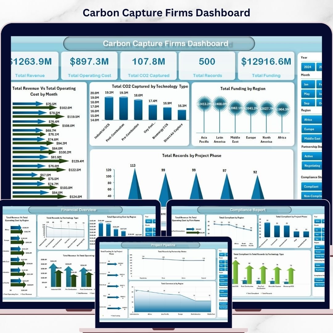 Unlock powerful insights with the Carbon Capture Firms Dashboard, a ready-to-use Excel dashboard designed specifically for carbon capture companies and analysts. Simply update your data in the provided Data Sheet, hit refresh from the Excel Ribbon’s Data tab, and watch your entire dashboard dynamically update with accurate, real-time visuals. This dashboard offers multiple page views, making it easy to analyze key metrics and trends at a glance.