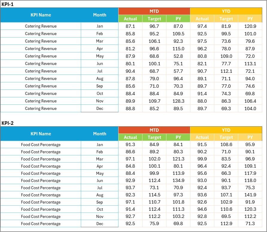 🔹 Food Service KPI Scorecard in Excel — Track food service KPIs including COGS, table turnover, and customer retention with MTD/YTD analysis.