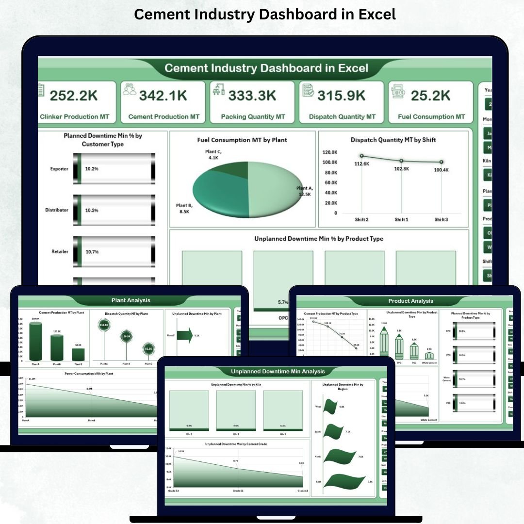 A Cement Industry Dashboard in Excel solves all these challenges instantly. It brings together every critical KPI in a clean, visual, ready-to-use format. With slicers, charts, automated summaries, and structured pages, the dashboard turns raw plant data into clear, real-time insights. Since it works fully inside Excel, every team—from operators to managers—can use it without learning new software.