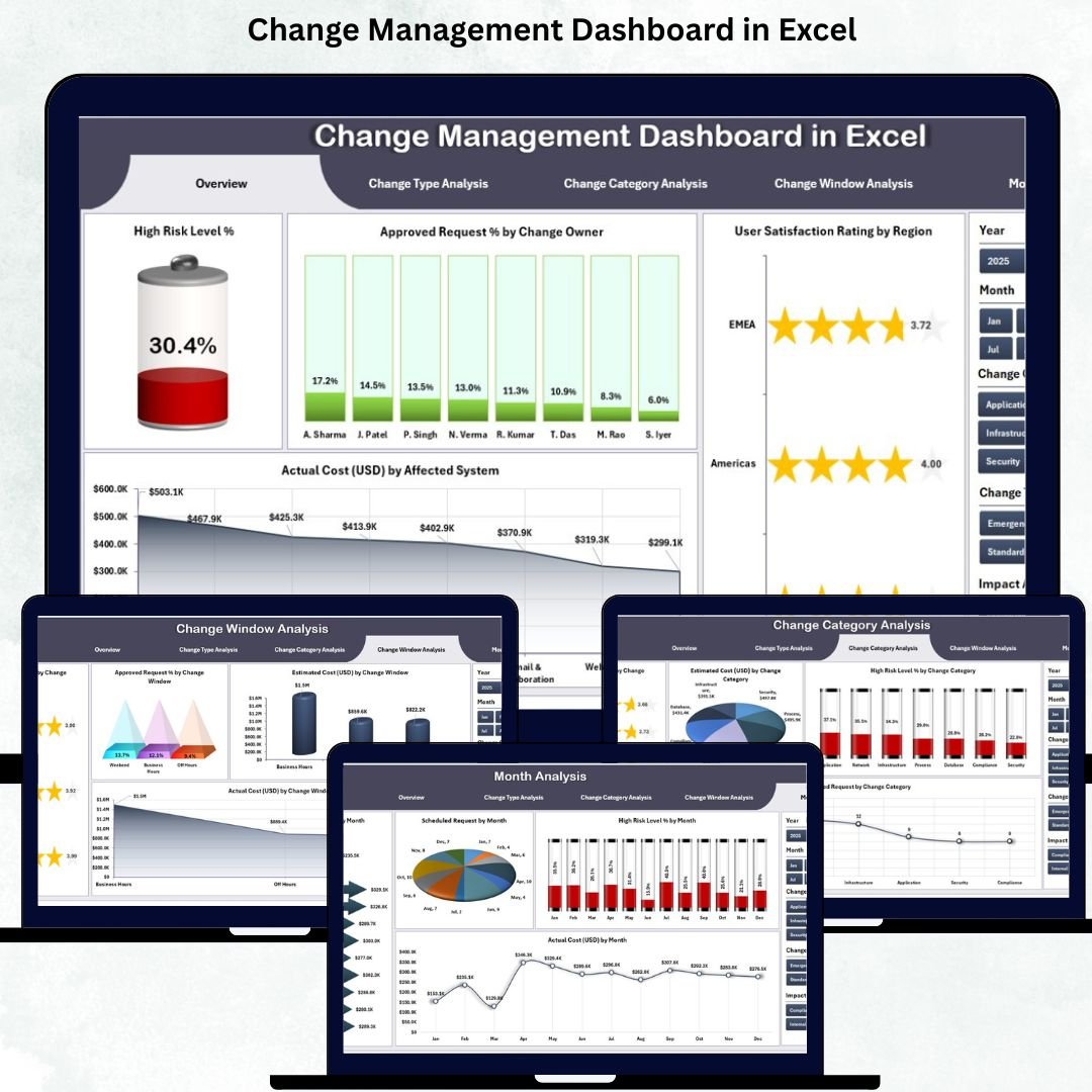 That’s exactly why the Change Management Dashboard in Excel is a must-have tool for every company. Designed with a clean layout and powerful analytics, this dashboard consolidates all change-related information in one place. It helps leaders monitor change requests, track progress, measure risk levels, verify cost accuracy, and understand user satisfaction with complete clarity. Whether your organization handles a few changes or hundreds every month, this dashboard brings structure, accuracy, and speed to the entire change management process.