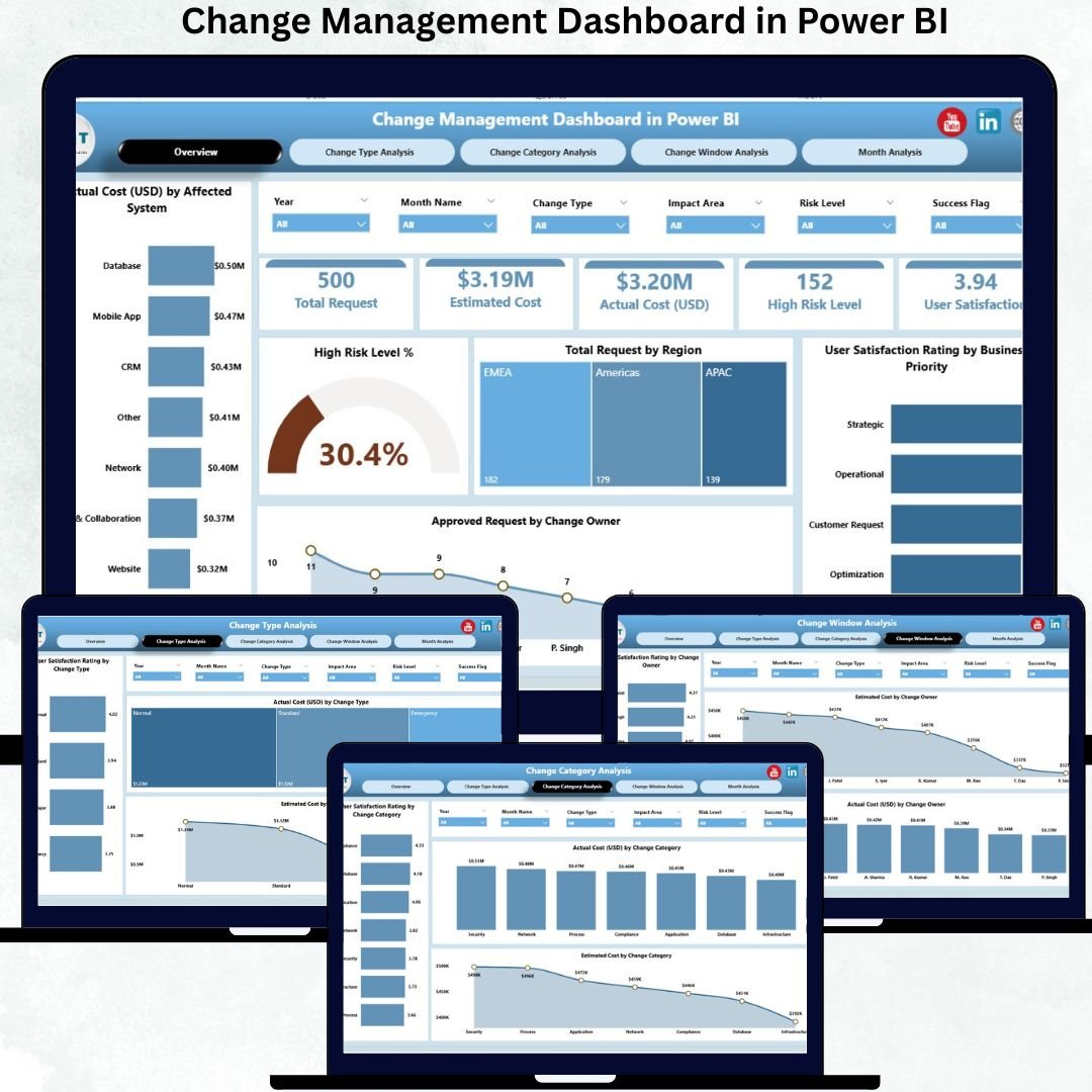 The Change Management Dashboard in Power BI transforms raw change request data into clear, interactive, and decision-ready insights. Instead of reacting to problems after they occur, organizations can proactively monitor change costs, risks, approvals, satisfaction, ownership, and trends—all in one centralized dashboard.