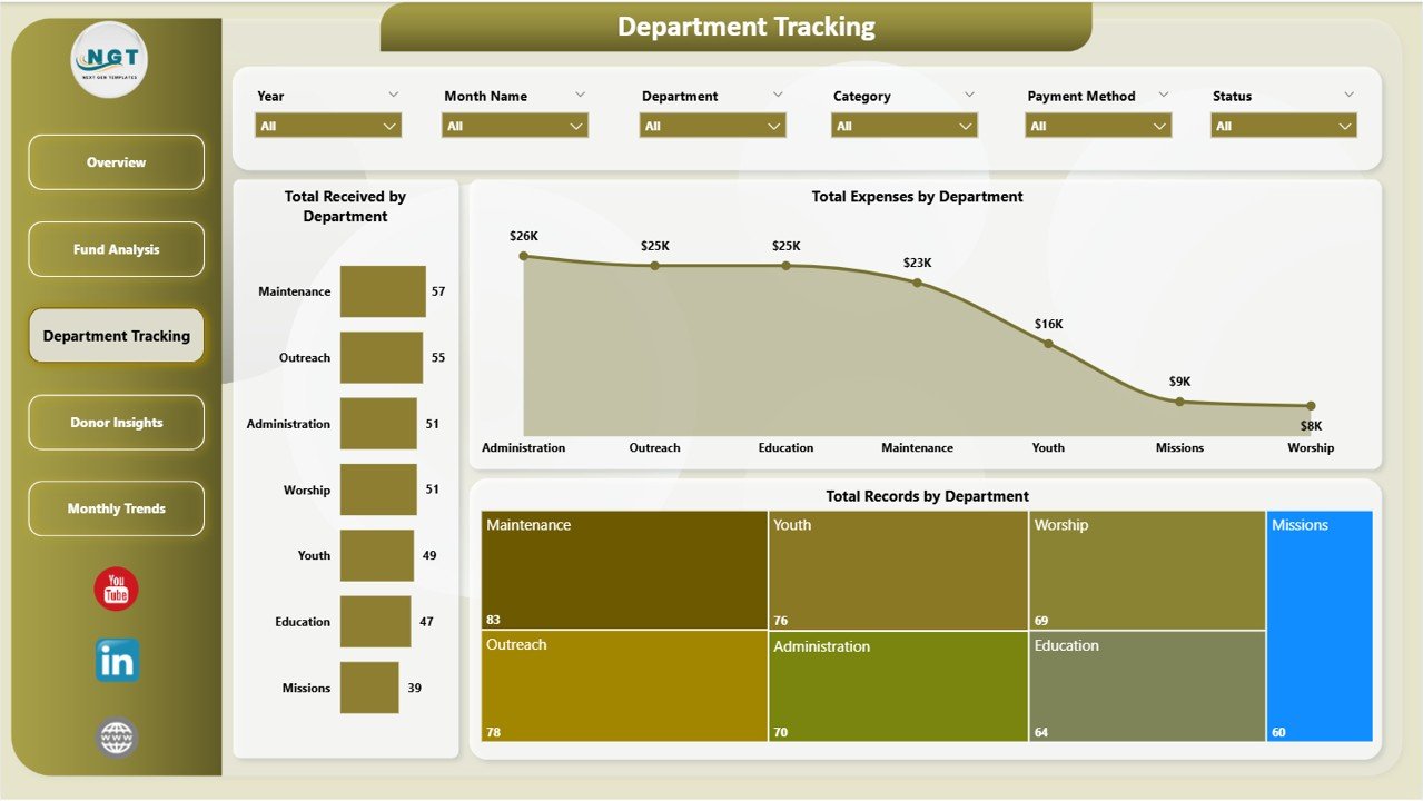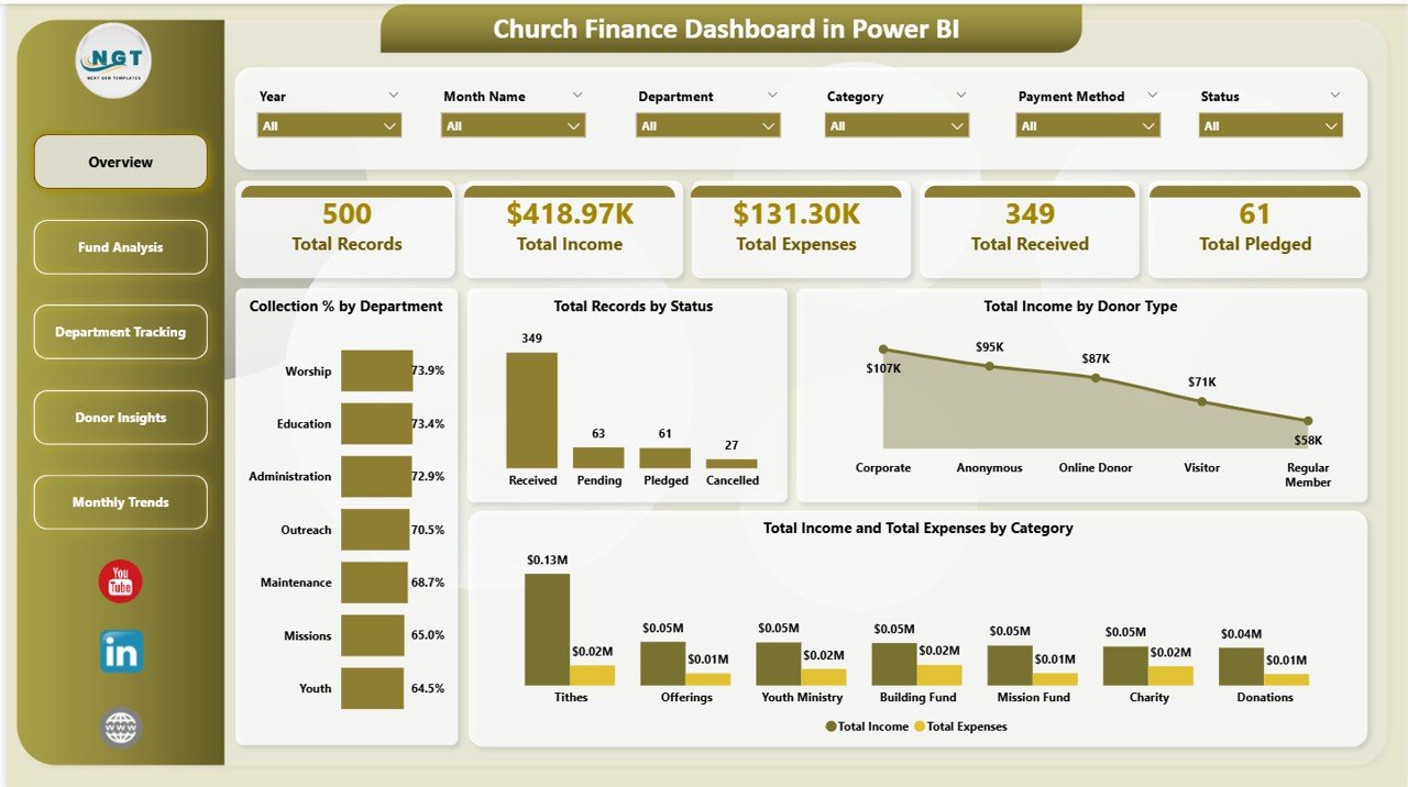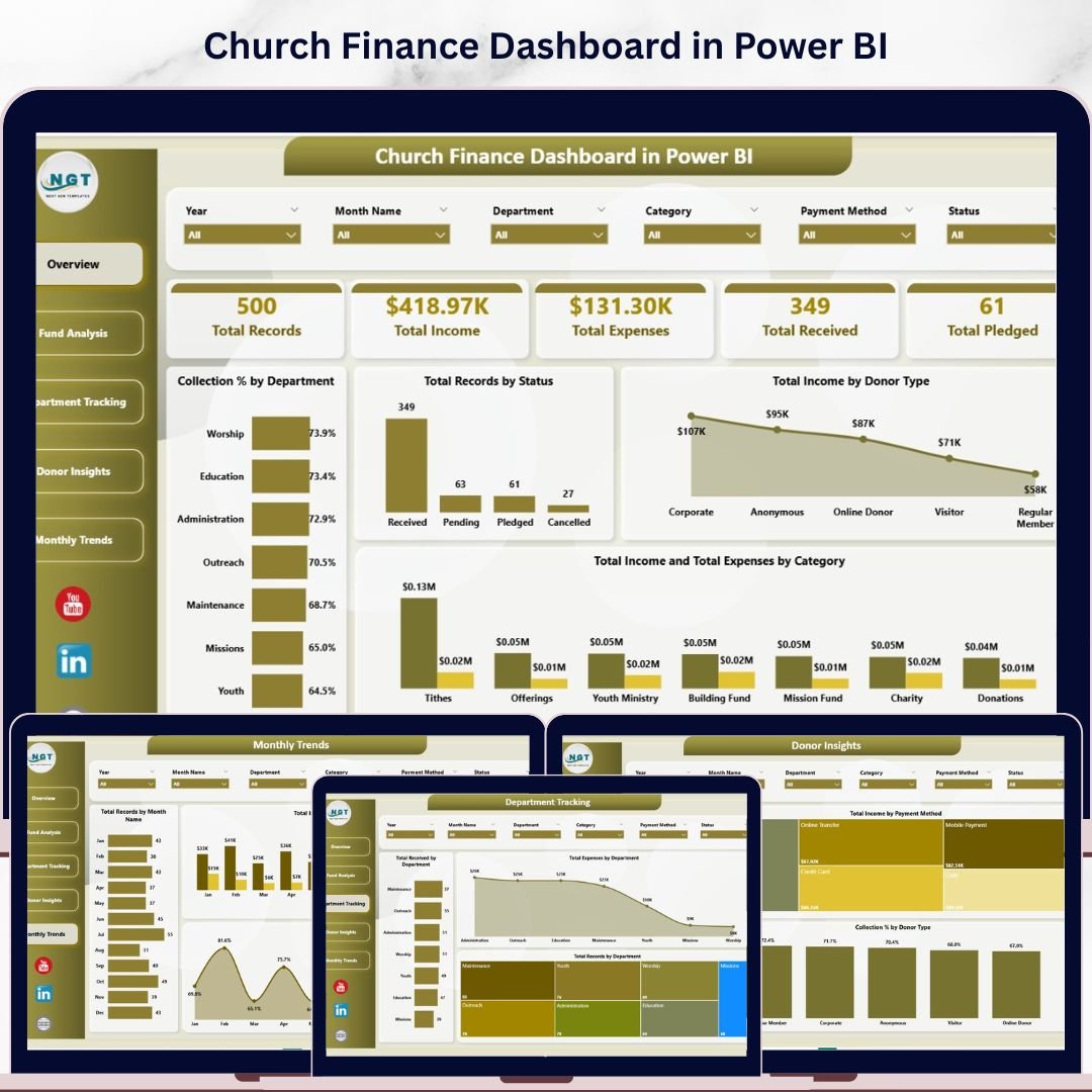 The Church Finance Dashboard in Power BI from Nextgen Templates is one of the best options. It provides a complete view of income, expenses, donors, departments, and monthly trends in a single interactive Power BI file with 5 dashboard pages and dynamic analytical charts.