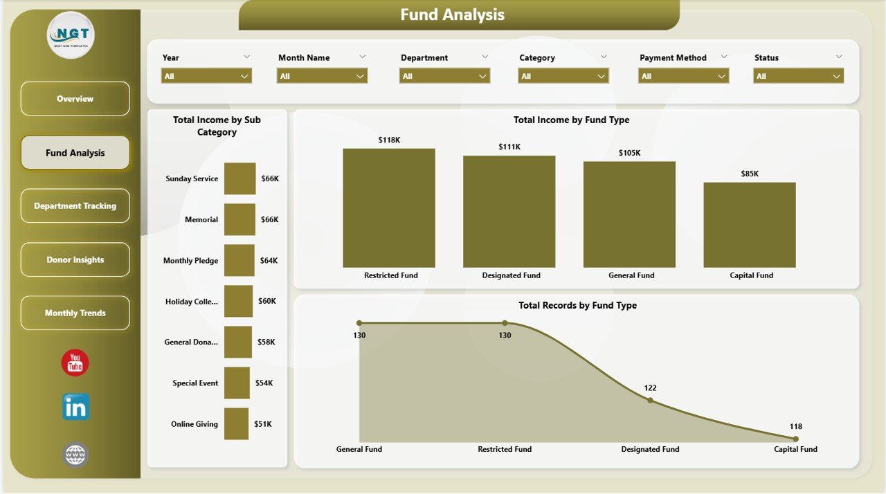 ✨ Fund Analysis Page – Breaks down financial data by fund type with 3 charts: Total Income by Sub Category, Total Income by Fund Type, and Total Records by Fund Type. This page helps church treasurers understand where funds are coming from and how they are distributed across different fund categories.