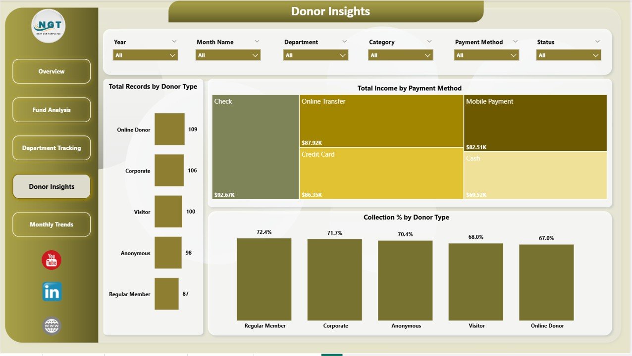 📌 Multiple Analytical Charts – Each page presents focused analysis through visually engaging charts including Collection % by Department, Total Records by Status, Total Income by Donor Type, and Total Income and Total Expenses by Category.