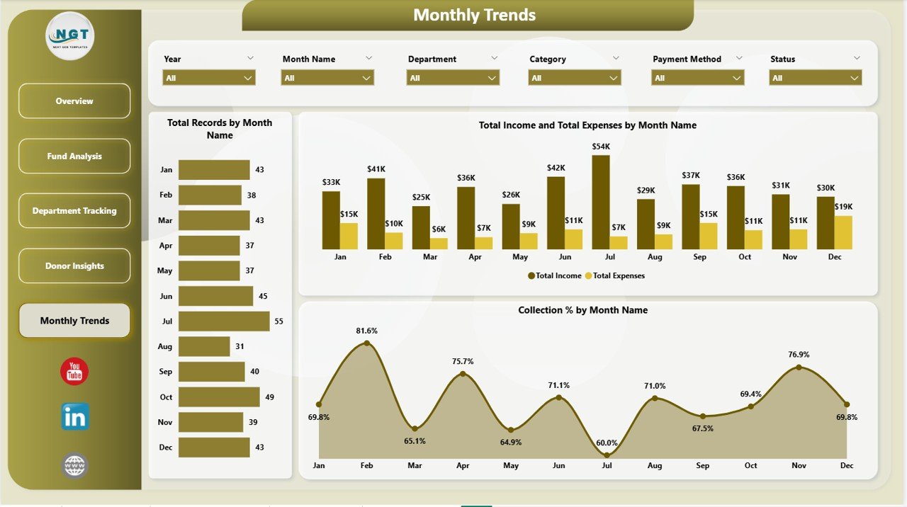 ✨ Monthly Trends Page – Tracks time-based financial patterns through 3 charts: Total Records by Month Name, Total Income and Total Expenses by Month Name, and Collection % by Month Name. Spot seasonal giving trends and plan church budgets accordingly.