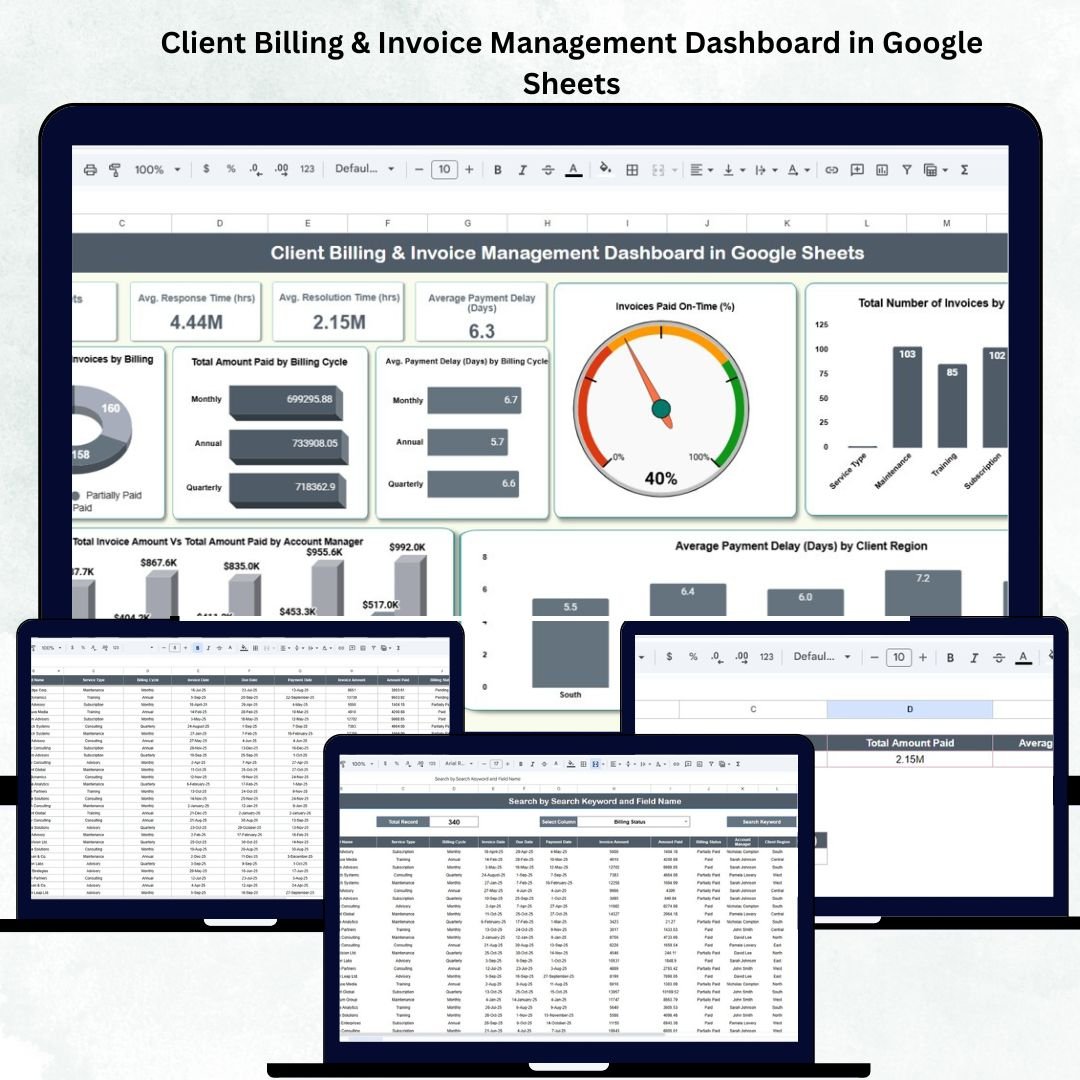 The Client Billing & Invoice Management Dashboard in Google Sheets is a complete financial control system designed for efficiency and clarity.