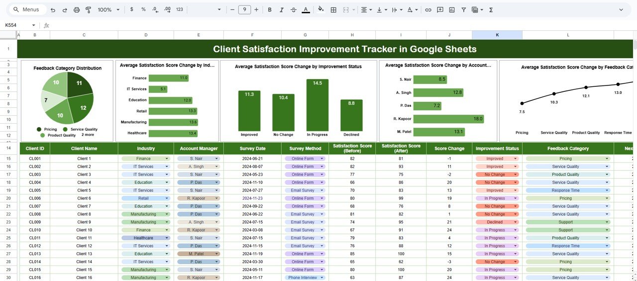 The Client Satisfaction Improvement Tracker in Google Sheets is built to solve this exact problem. It provides a centralized, easy-to-use system that helps teams track client feedback, monitor satisfaction score changes, and follow improvement actions from planning to completion. Instead of reacting to complaints, organizations can proactively manage client experience using clear data and visual insights.