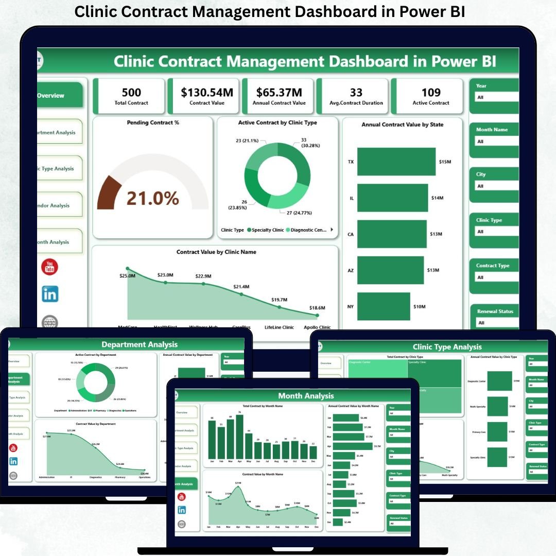 Because this solution is built on Microsoft Power BI, it delivers high-performance visuals, dynamic filtering, and real-time updates. Users can analyze contracts by clinic name, clinic type, department, vendor, state, and month without writing formulas or managing complex files. As a result, clinics save time, reduce operational risk, and improve financial control.