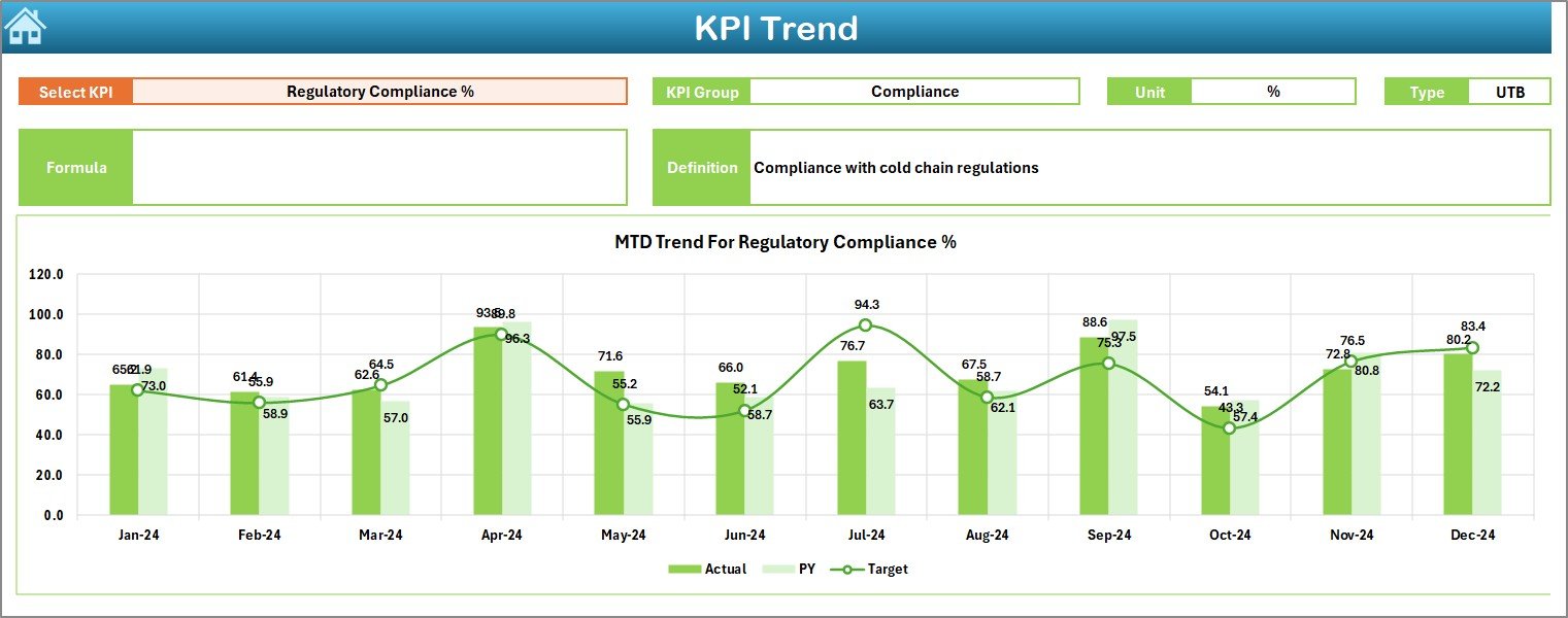 🧭 One-Click Navigation – Jump between worksheets (Dashboard, Trend, Targets, etc.) using interactive buttons on the Home sheet — no manual scrolling needed.Cold Chain Logistics KPI Dashboard in Excel