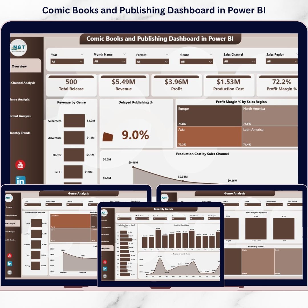 This ready-to-use Power BI dashboard transforms raw publishing data into interactive, visual, and actionable insights. It helps comic publishers, studios, and independent creators track revenue, control production costs, monitor profit margins, and identify publishing delays in real time. Instead of reacting late, teams can take proactive, data-driven decisions with confidence.